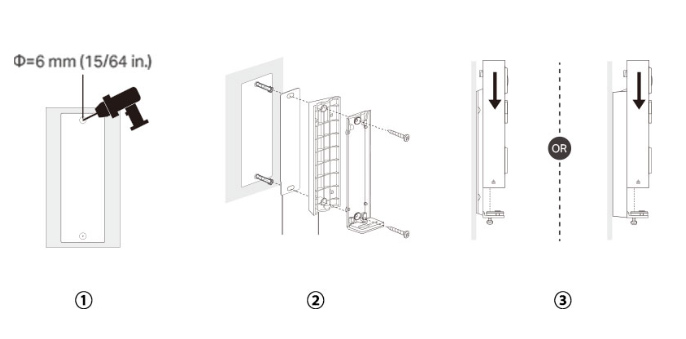 Khoan lỗ bằng mẫu định vị, lắp chốt và bắt vít giá đỡ (có thể dùng hoặc không dùng giá nghiêng). Trượt Tapo Doorbell Mini vào giá đỡ cho đến khi nghe tiếng “tách”, sau đó siết chặt vít ở dưới.