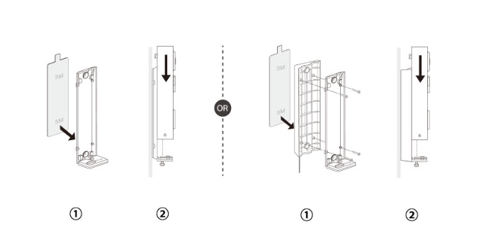 Dùng băng keo 2 mặt 3M để dán giá đỡ (có thể dùng hoặc không dùng giá nghiêng) lên tường. Trượt Tapo Doorbell Mini vào giá đỡ cho đến khi nghe tiếng “tách”, sau đó siết chặt vít ở dưới.