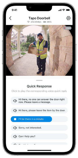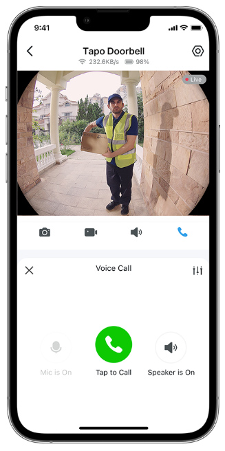 Bạn sẽ nhận được cuộc gọi khi có người bấm chuông và có thể trò chuyện ngay lập tức – giống như một cuộc gọi điện thoại thông thường. Không cần mở khóa màn hình hay mở ứng dụng Tapo thủ công.