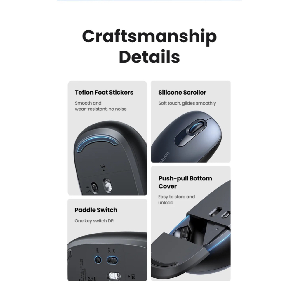 UGreen MU105 là một sản phẩm chuột không dây đa năng với nhiều tính năng ưu việt. Với bốn mức điều chỉnh DPI (800/1200/1600/2400), người dùng có thể linh hoạt điều chỉnh độ nhạy của chuột để đáp ứng các nhu cầu sử dụng khác nhau, đặc biệt là trong các tình huống đòi hỏi độ nhạy cao.