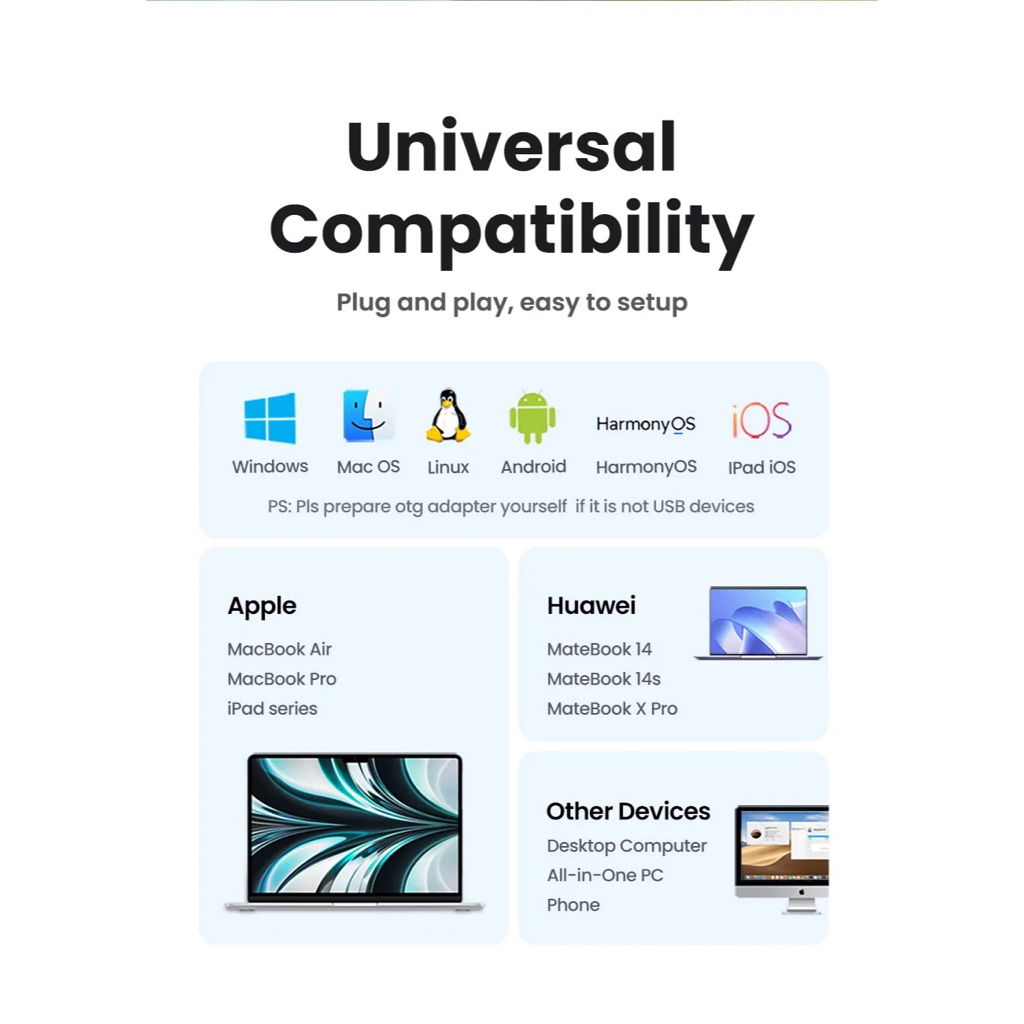 Chuột không dây UGREEN MU105 5 tương thích với các thiết bị như PC, laptop và các thiết bị di động có trang bị chức năng OTG. Chuột không cần cài Driver mà vẫn hoạt động bình thường.