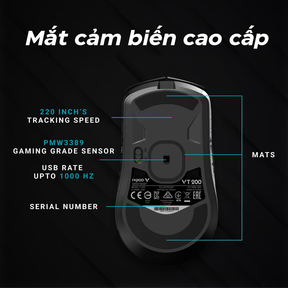 Rapoo VT200 Wireless được trang bị mắt cảm biến quang học cao cấp phù hợp với Gaming, cho độ chính xác cao.