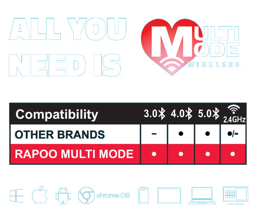Nhằm mục đích cải thiện quy trình làm việc của các chuyên gia, công nghệ Không dây Đa chế độ của Rapoo đảm bảo khả năng tương thích hoàn toàn và ghép nối tự động. Cho dù thiết bị của bạn hỗ trợ Bluetooth 3.0 trở về trước, Bluetooth 4.0 trở lên hay bạn muốn kết nối qua khóa Wi-Fi 2,4 GHz, bạn có thể chắc chắn rằng chuột M100 Silent tương thích.