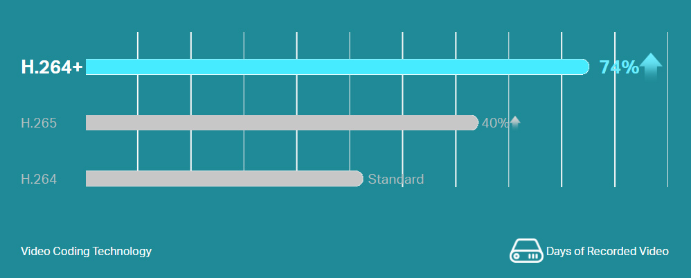 - H.264+: Không sử dụng bất kỳ băng thông bổ sung nào, camera của bạn truyền video nén rõ nét để tiết kiệm dung lượng đĩa, giảm tải mạng và giảm chi phí giám sát mà không làm giảm chất lượng hình ảnh.