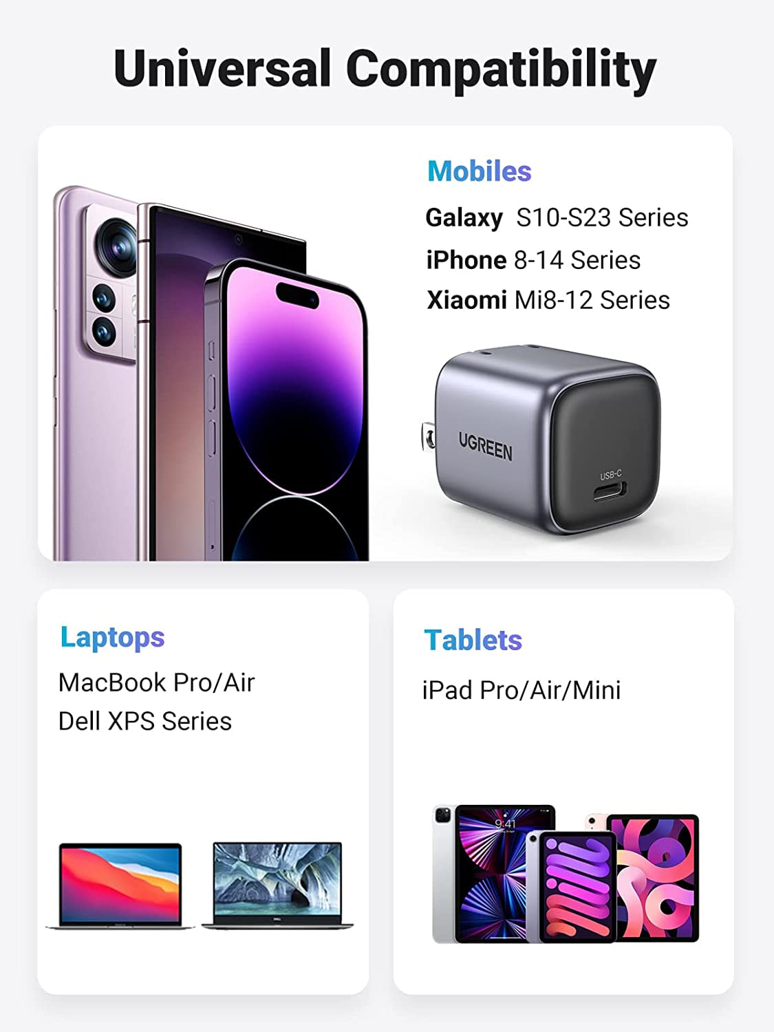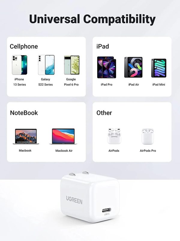 Sử dụng đa năng cho nhiều thiết bị: Cùng với nhiều giao thức sạc nhanh, Củ sạc Ugreen 90901 & 15329 có khả năng tương thích mà các bộ nguồn khác không có được, chẳng hạn như tai nghe nhét tai, điện thoại, máy tính bảng và thậm chí cả MacBook Air.
