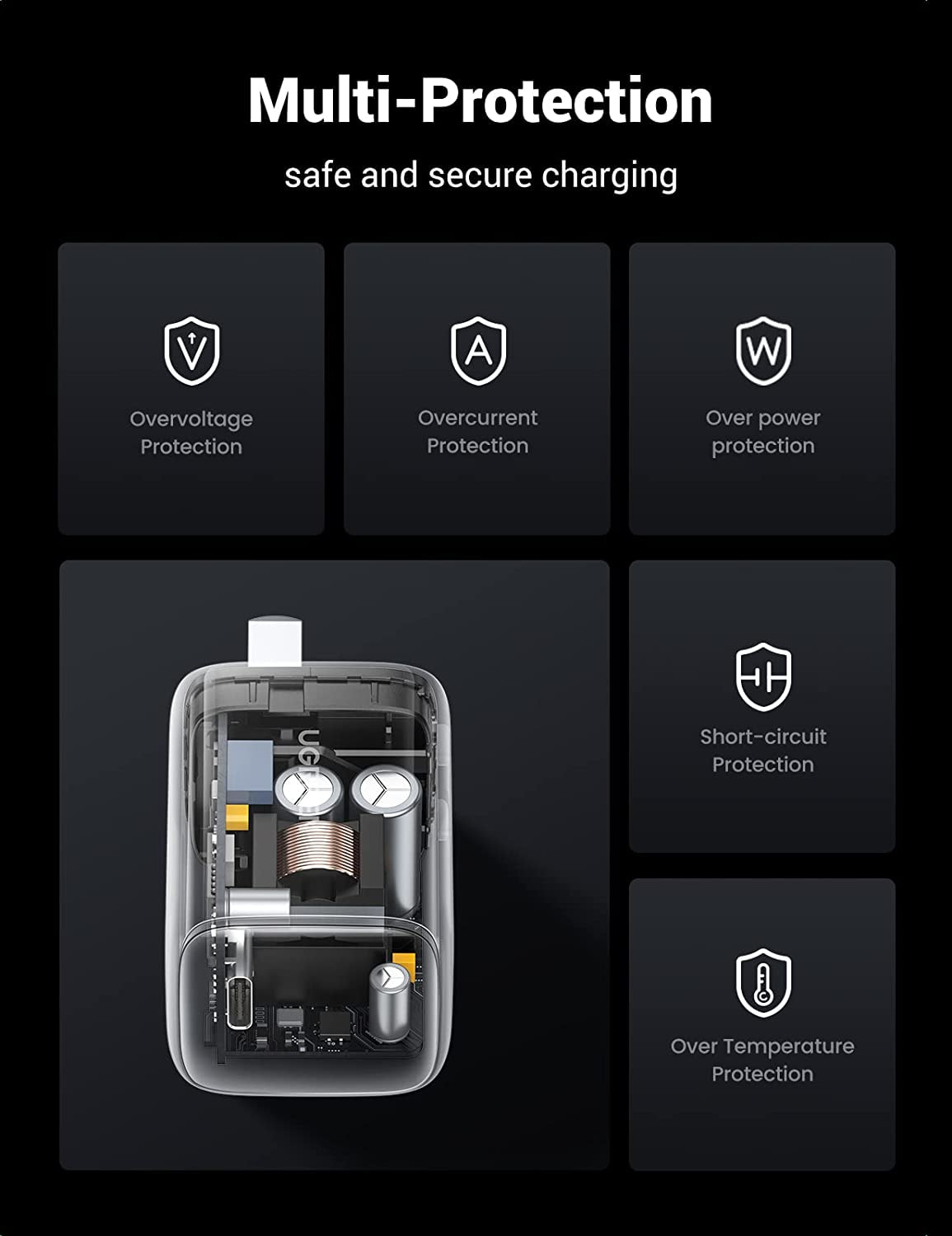 Real-Time Protection: Củ sạc tự động quét nhiệt độ 800 lần/giây với công nghệ Thermal Guard, không bao giờ phải lo lắng về độ an toàn khi sạc với với Củ sạc Ugreen 90901 & 15329
