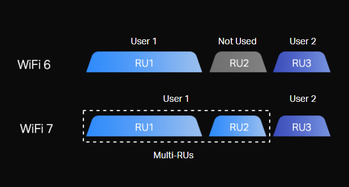 Với Wi-Fi 6, mỗi người dùng chỉ có thể gửi hoặc nhận khung dữ liệu trên một đơn vị tài nguyên được chỉ định (RU), điều này hạn chế đáng kể tính linh hoạt của việc lập lịch tài nguyên phổ tần. Để giải quyết vấn đề này và nâng cao hiệu quả phổ tần, Wi-Fi 7 cho phép nhiều RU được gán cho một người dùng duy nhất và có thể kết hợp các RU để tăng hiệu quả truyền tải.
