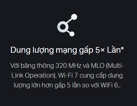 Wi-Fi 7 giới thiệu các công nghệ tiên tiến như băng thông cực rộng 320 MHz, điều chế 4096-QAM, Multi-RU và Multi-Link Operation để mang đến tốc độ nhanh hơn 4,8 lần so với Wi-Fi 6 và nhanh hơn 13 lần so với Wi-Fi 5. Mở khóa nhiều kịch bản sử dụng hơn bao giờ hết.