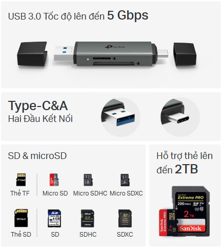 - Hỗ trợ 2 khe cắm thẻ: Có khe cắm riêng cho thẻ SD và microSD (TF). Thiết bị có khả năng đọc và ghi dữ liệu đồng thời trên cả hai thẻ.