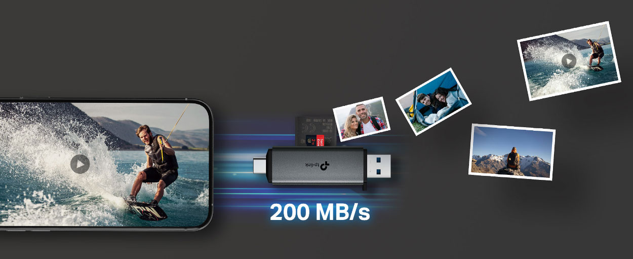 Với hai khe cắm thẻ, bạn có thể dễ dàng truyền dữ liệu từ thẻ SD và microSD cùng lúc hoặc giữa hai thẻ với nhau. UA430D tương thích với các thẻ UHS-I, cho phép di chuyển tệp dung lượng lớn với tốc độ đọc siêu nhanh lên đến 200MB/s.*