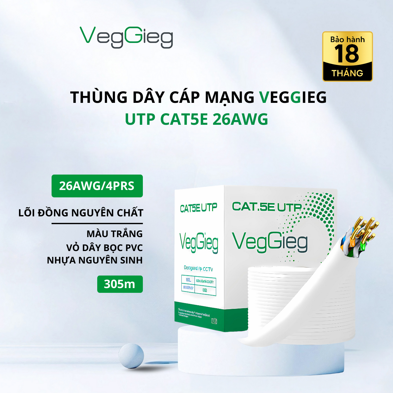 Dây Mạng VegGieg UTP Cat5e 26AWG – Cuộn 305m màu trắng