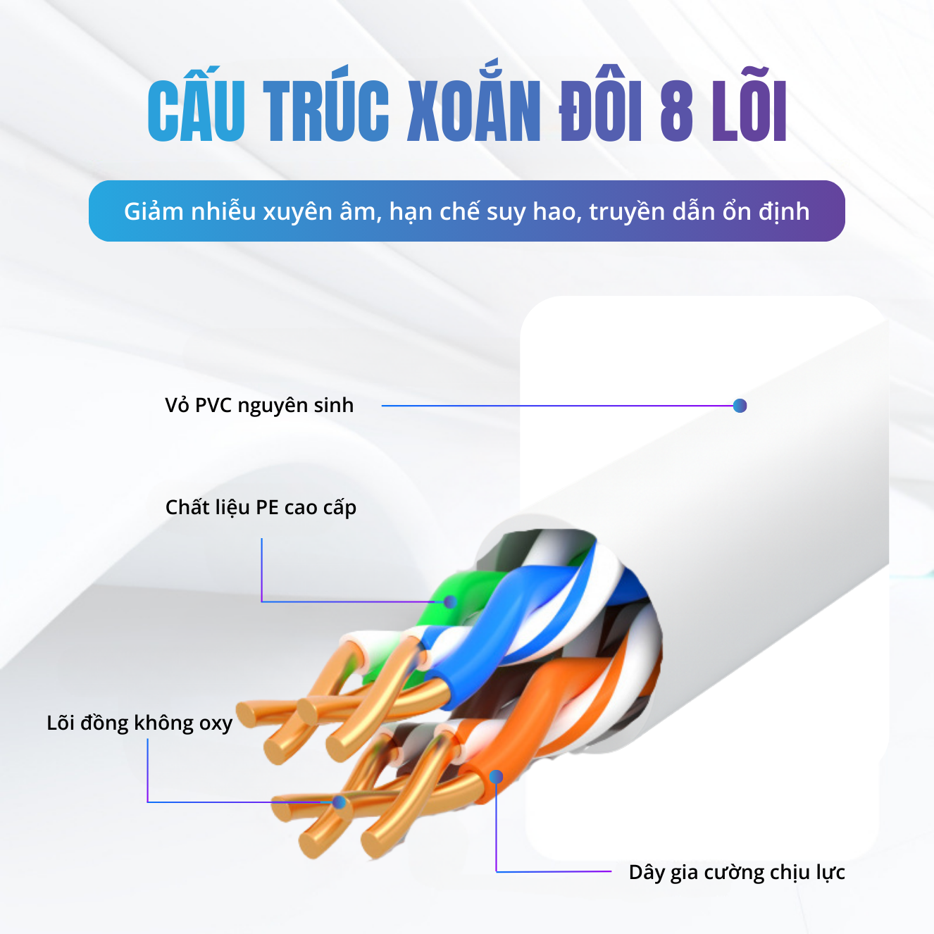 Ruột dẫn: Đồng nguyên chất 99,9% (Cu 0.4mm, 26AWG/4PRS), đảm bảo truyền dẫn tín hiệu ổn định và giảm thiểu suy hao.