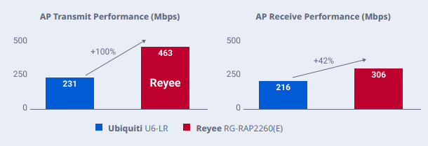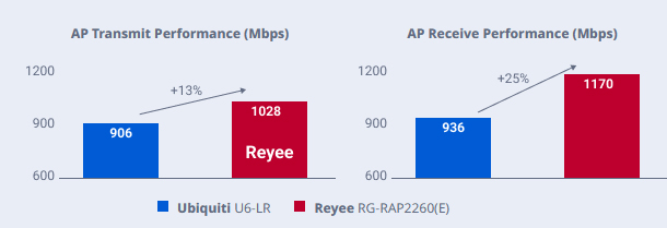 Đài phát thanh 2,4 GHz và 5 GHz của Reyee RG-RAP2260 (E) AP vượt trội hơn đáng kể so với Ubiquiti U6-LR trong cả thử nghiệm truyền và nhận tín hiệu. *
