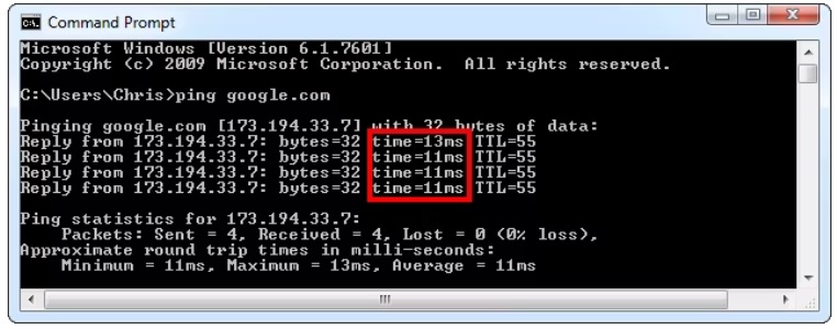 Bạn có thể đo độ trễ giữa máy tính của bạn và địa chỉ web bằng lệnh ping. Trong ví dụ của chúng tôi, phải mất 11 mili giây để lưu lượng truy cập giữa máy tính của chúng tôi và máy chủ của Google. Nếu chúng ta có kết nối Internet vệ tinh, tốc độ này có thể lên tới 700ms.