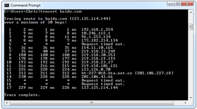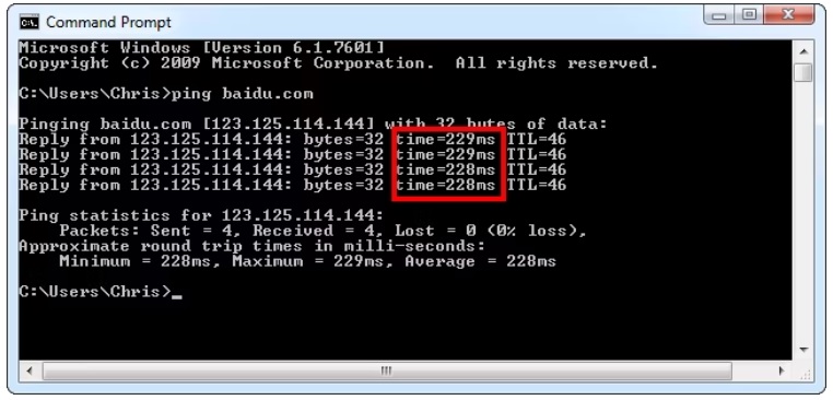 Để hiển thị tác động của khoảng cách đến độ trễ, chúng ta có thể ping Baidu – một công cụ tìm kiếm của Trung Quốc. Baidu không có bất kỳ máy chủ nào ở Bắc Mỹ nên máy tính của chúng tôi phải liên lạc với máy chủ của nó ở Trung Quốc. Độ trễ giữa máy tính của chúng tôi và máy chủ của Baidu là 228 mili giây.