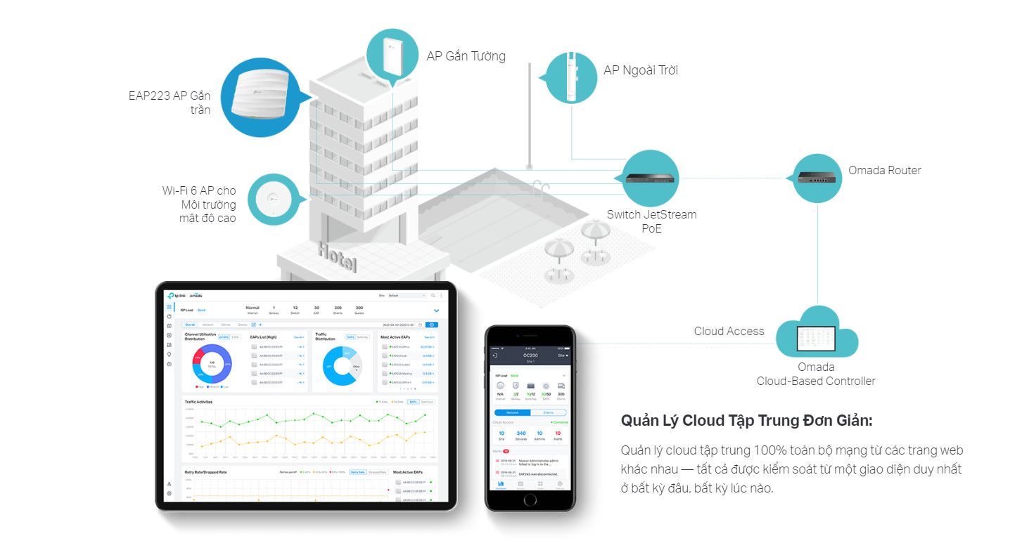 Quản Lý Tập Trung: Truy cập cloud và ứng dụng Omada để quản lý cực kỳ tiện lợi và dễ dàng.