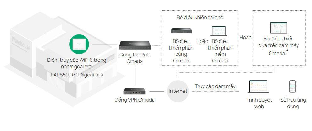 - Quản lý đám mây tập trung : kiểm soát mọi thứ từ một giao diện duy nhất ở bất kỳ đâu thông qua ứng dụng Omada hoặc giao diện người dùng web .