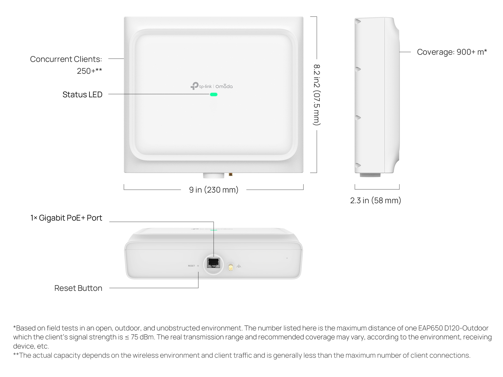 *Dựa trên các thử nghiệm thực tế trong môi trường mở, ngoài trời và không bị cản trở. Con số được liệt kê ở đây là khoảng cách tối đa của một EAP650 D30-Ngoài trời có cường độ tín hiệu của khách hàng ≥ -75 dBm. Phạm vi truyền dẫn thực tế và vùng phủ sóng khuyến nghị có thể thay đổi tùy theo môi trường, thiết bị thu, v.v.