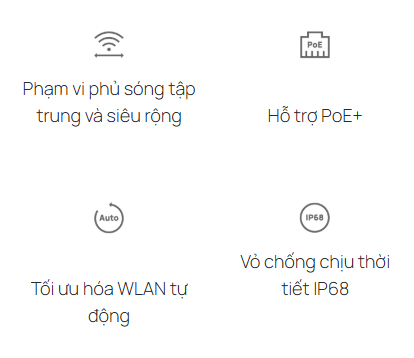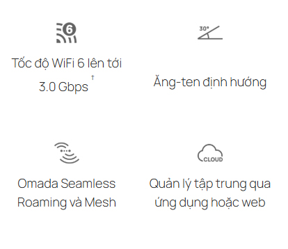 | Bảo mật Wi-Fi | • Captive Portal Authentication§ • Access Control • Wireless Mac Address Filtering • Wireless Isolation Between Clients • SSID to VLAN Mapping • Rogue AP Detection • 802.1X Support • WPA-Personal/Enterprise, WPA2-Personal/Enterprise, WPA3-Personal/Enterprise |