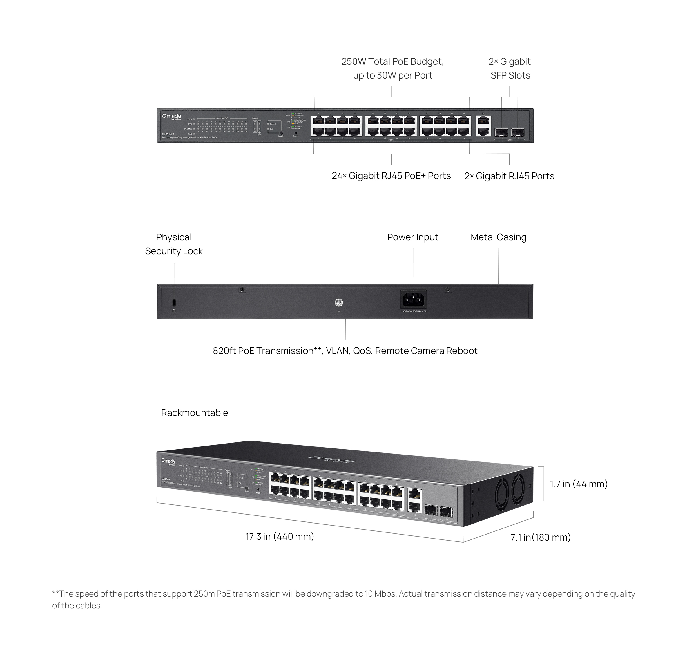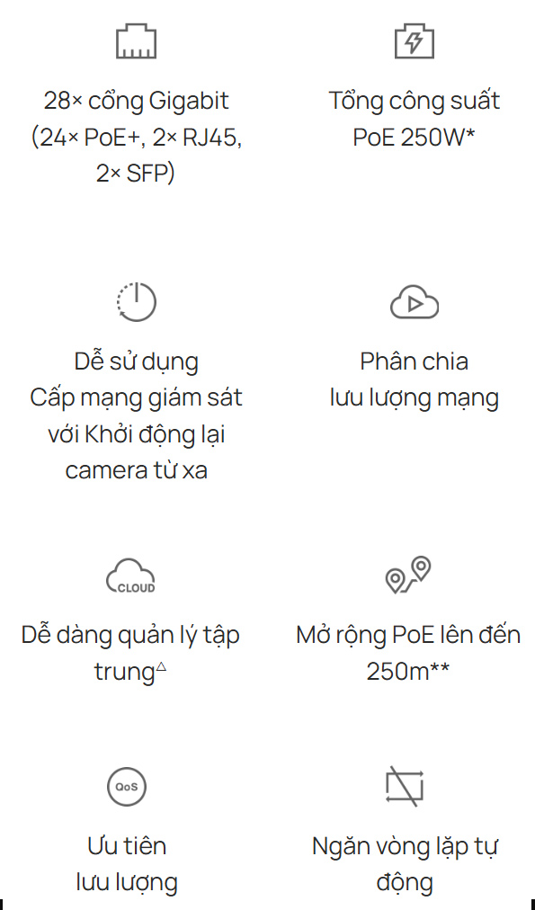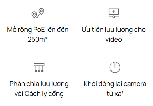 Long-Range PoE: Hỗ trợ truyền dữ liệu và nguồn điện ở khoảng cách lên đến 250m (tốc độ cổng sẽ giảm xuống 10 Mbps).