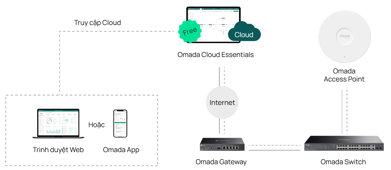 Omada SDN: Cho phép quản lý tập trung qua Cloud (web hoặc ứng dụng Omada). Bạn có thể sử dụng miễn phí giải pháp Omada Cloud Essentials để giám sát mạng từ xa.
