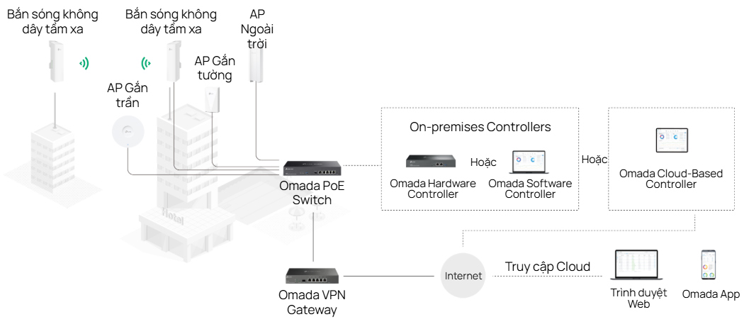 *Các chức năng này yêu cầu sử dụng Bộ điều khiển phần cứng, Bộ điều khiển phần mềm hoặc Bộ điều khiển dựa trên đám mây Omada. Tính năng Cung cấp Zero-Touch yêu cầu sử dụng Bộ điều khiển dựa trên đám mây Omada.
