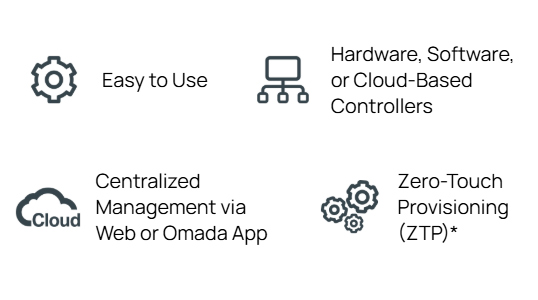 *Các chức năng này yêu cầu sử dụng Bộ điều khiển phần cứng, Bộ điều khiển phần mềm hoặc Bộ điều khiển dựa trên đám mây Omada. Tính năng Cung cấp Zero-Touch yêu cầu sử dụng Bộ điều khiển dựa trên đám mây Omada. Vui lòng truy cập Danh sách sản phẩm Bộ điều khiển dựa trên đám mây Omada để tìm tất cả các model được Bộ điều khiển dựa trên đám mây Omada hỗ trợ.