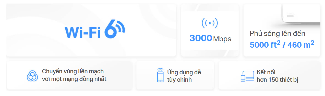 ‡ Roaming liền mạch yêu cầu thiết bị đầu cuối hỗ trợ 802.11k/v/r và có thể yêu cầu cấu hình bổ sung. Hiệu suất có thể thay đổi tùy thuộc vào thiết bị đầu cuối.