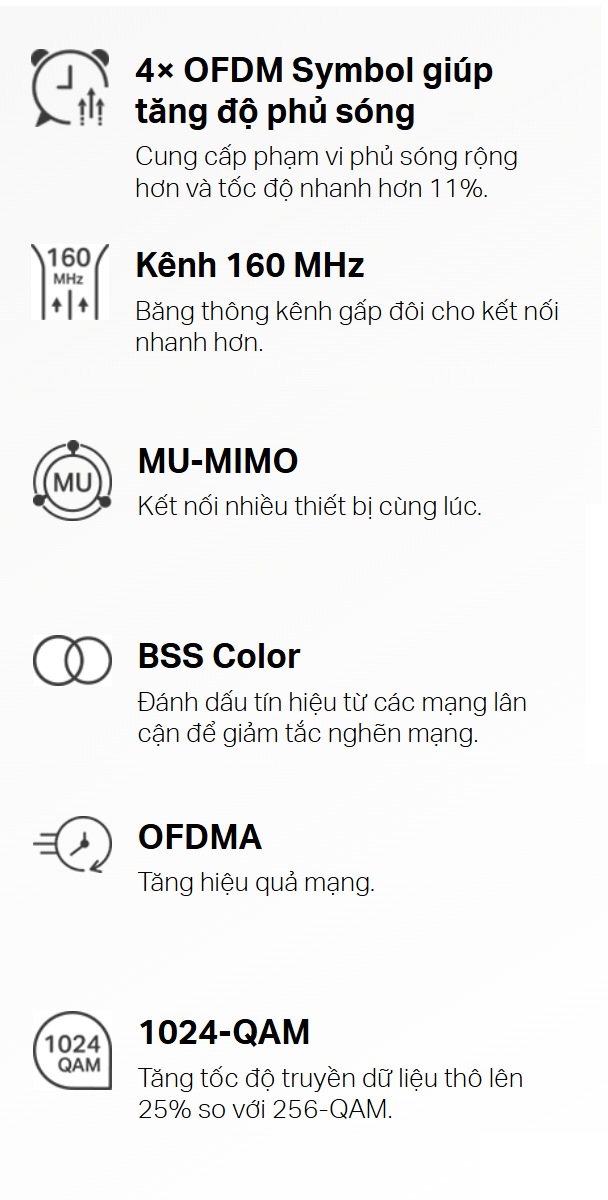△ Việc sử dụng Wi-Fi 6 và các tính năng khác như OFDMA, MU-MIMO, 1024-QAM, HE160, BSS Color yêu cầu thiết bị đầu cuối cũng hỗ trợ các tính năng tương ứng. Băng thông 160 MHz có thể không khả dụng trên băng tần 5 GHz ở một số khu vực/quốc gia do hạn chế pháp lý. Sản phẩm này có thể không hỗ trợ tất cả các tính năng bắt buộc của tiêu chuẩn IEEE 802.11ax. Có thể cần cập nhật phần mềm thêm để có các tính năng sẵn có.