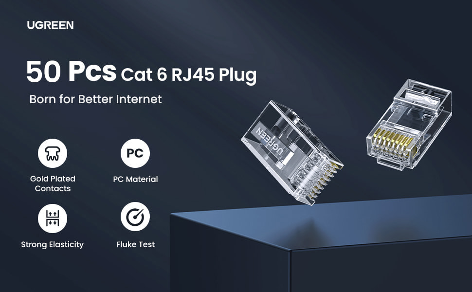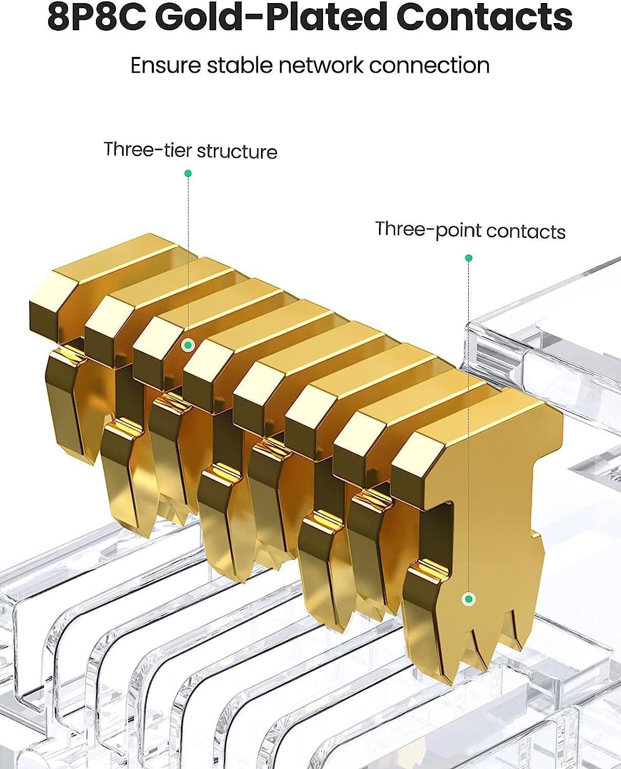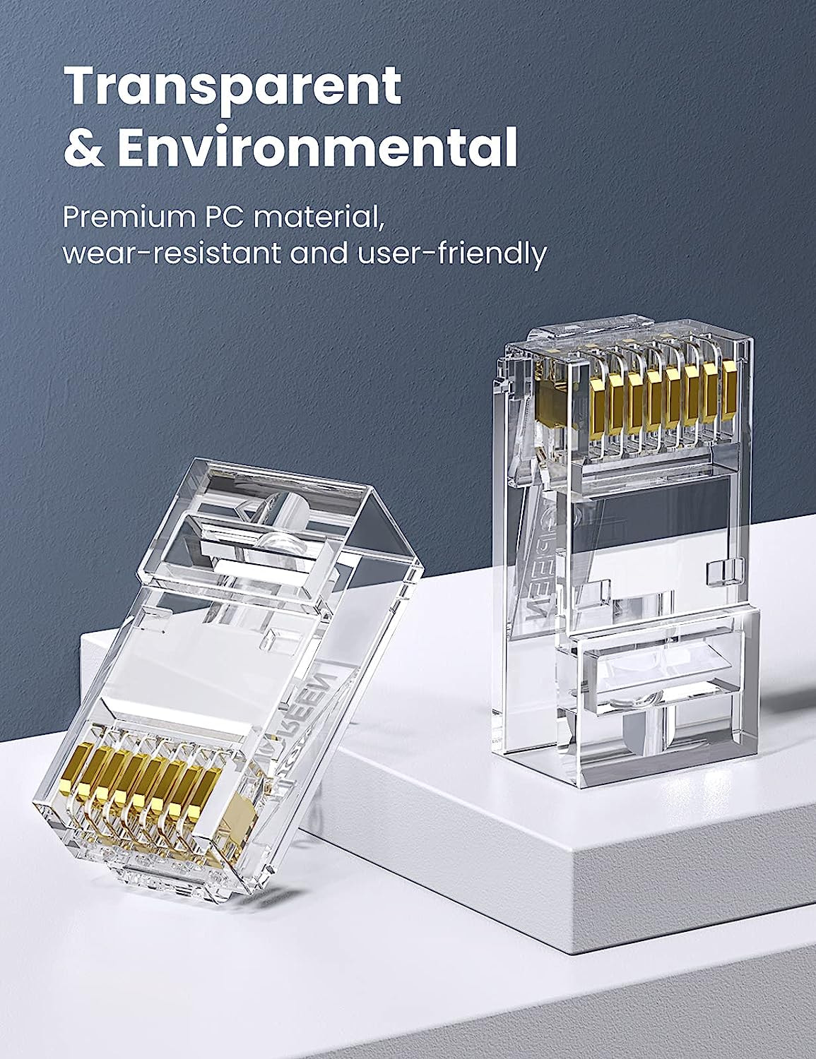Hạt mạng xuyên thấu RJ45 Cat6/5/5e Ugreen 20798 chất liệu nhựa tinh khiết tăng độ cứng và không bị giòn so với các sản phẩm sử dụng nhựa tái chế khác, chân cắm tiếp xúc mạ vàng chống chịu oxy hoá tốt hơn.
