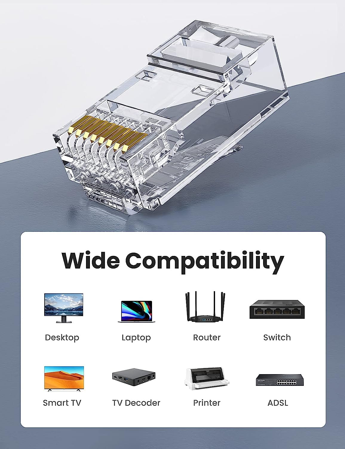 Hạt mạng RJ45 UTP xuyên thấu Ugreen 20798 hoạt động tốt với Cáp Ethernet CAT 6, CAT 5, CAT 5e. Đầu bấm mạng Ugreen 20798 tương thích tốt với dây Cat6 Tốc độ truyền lên tới 1000Mbps, nhanh hơn gấp 10 lần so với đầu cắm Cat5 (100Mbps) Đầu nối xuyên thấu giúp bấm dễ dàng hơn, các tiếp điểm mạ vàng 8P8C đảm bảo kết nối mạng nhanh hơn và ổn định hơn tăng. Hạt mạng xuyên thấu Ugreen 20798 phù hợp với dây có đường kính từ 0.85mm-1.2mm tuân theo tiêu chuẩn sắp xếp dây T568A hoặc T568B.
