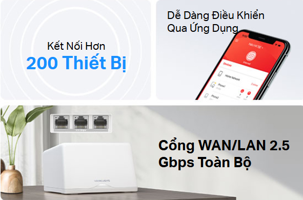 Các đơn vị mesh Halo hoạt động như một mạng thống nhất với một tên mạng và mật khẩu duy nhất để loại bỏ các khu vực tín hiệu yếu. Nó có thể chọn tín hiệu tốt nhất và tận hưởng kết nối tốt nhất.† Halo H47BE phù hợp với truy cập mạng ISP 2.5G với 3 cổng WAN/LAN tự động nhận diện 2.5 Gbps. Cổng khác có thể được sử dụng như một kết nối LAN cho các thiết bị hoặc như một đường truyền có dây giữa các đơn vị Halo H. Theo cách này, nó cung cấp kết nối 2.5 Gbps tốt nhất cho một kỷ nguyên 2.5G thực sự, dù là có dây hay không dây.**