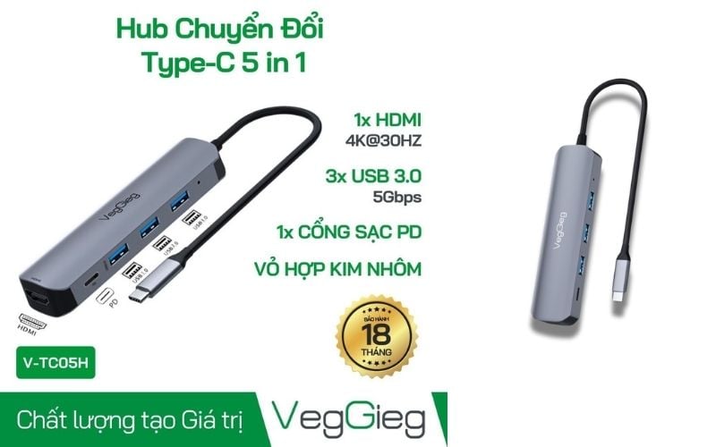 Hub chuyển đổi Type C 5 in 1 Veggieg là một sản phẩm chuyển đổi tín hiệu đa năng giúp kết nối laptop, máy tính bảng hoặc điện thoại di động có cổng TypeC ra màn hình HDMI hoặc các thiết bị khác. Với thiết kế nhỏ gọn, tiện lợi và chất lượng cao, sản phẩm này sẽ là sự lựa chọn tuyệt vời để mở rộng khả năng kết nối của các thiết bị công nghệ với nhau.