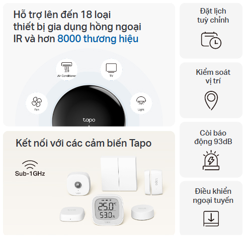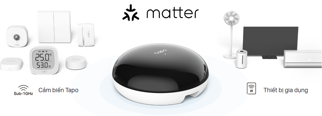 - Trung tâm kết nối đạt chứng nhận Matter - Kết nối và kiểm soát các thiết bị Hồng ngoại IR và cảm biến Tapo, tích hợp vào hệ sinh thái Matter.*