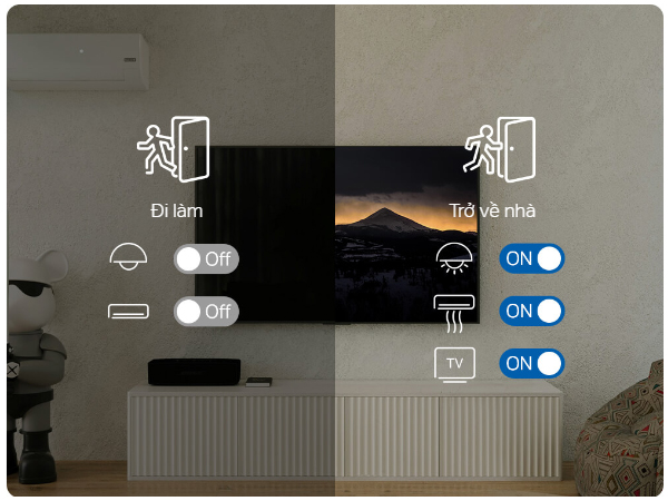 Tạo lịch trình thông minh cho các thiết bị của bạn để phù hợp với thói quen hàng ngày. Ví dụ, điều hòa và đèn sẽ tự tắt khi bạn rời đi, và tự động chỉnh điều hòa về 26°C, bật đèn và TV khi bạn trở về.