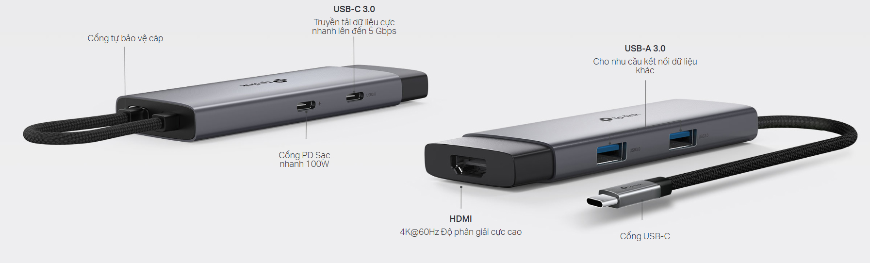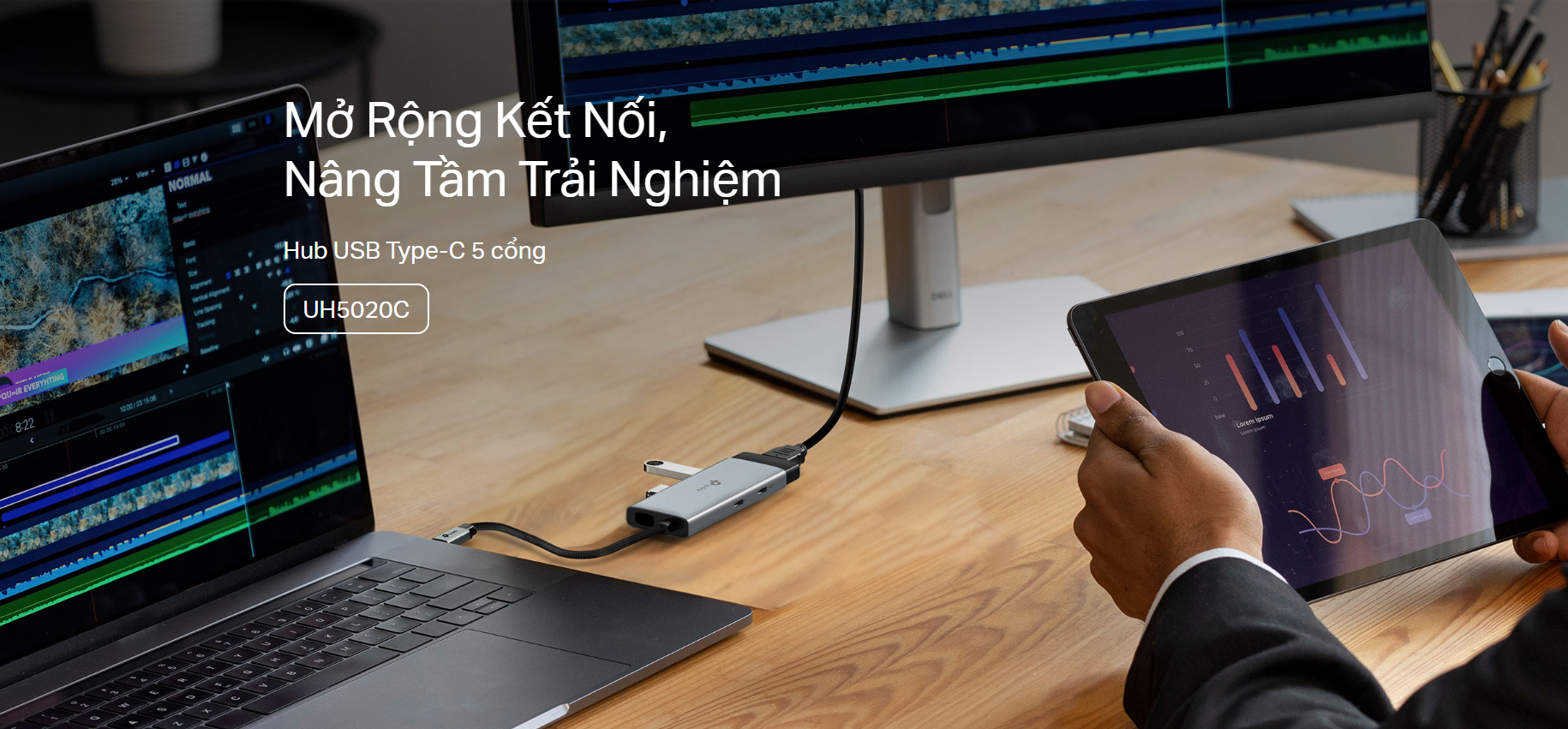 Bộ chia USB-C 5 cổng: UH5020C chuyển một cổng USB-C thành 5 cổng, bao gồm HDMI 4K@60Hz, Cung cấp nguồn 100W, 1 cổng USB-C dữ liệu, 2 cổng USB-A dữ liệu.