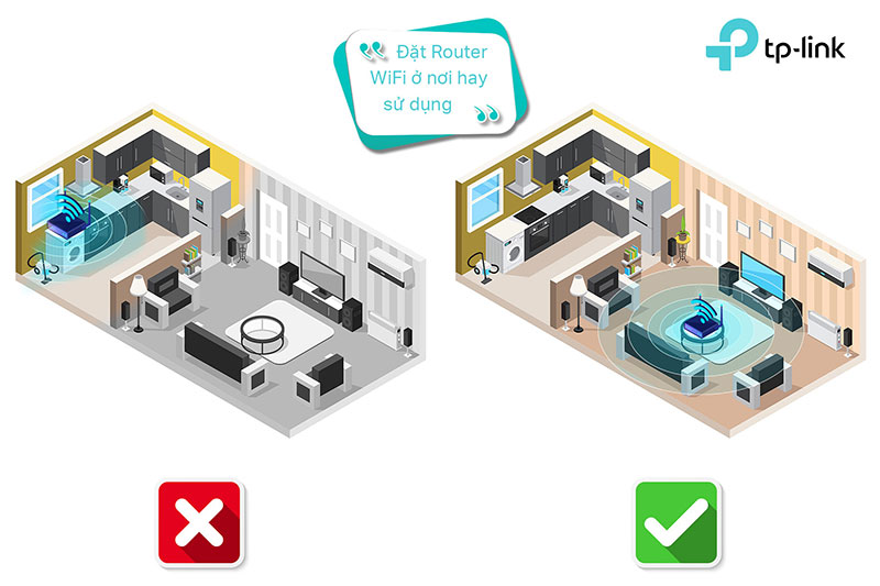 Việc đặt bộ phát WiFi ở vị trí phù hợp rất quan trọng. Tường, cửa ra vào, sàn nhà, trần nhà và các vật cản có thể ảnh hưởng đến tốc độ WiFi. Vị trí lý tưởng của bộ phát WiFi là càng gần trung tâm nhà càng tốt và ở khu vực thoáng đãng không có quá nhiều thiết bị điện tử xung quanh. Để tối đa hóa vùng phủ sóng WiFi, bạn nên đặt bộ phát WiFi ở vị trí cao hơn thay vì đặt trên sàn nhà.