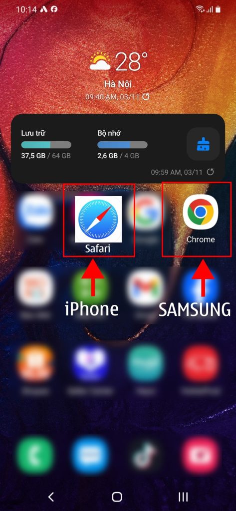 Tại màn hình chính trên điện thoại, nếu điện thoại Android Samsung thì mở app Chrome. Nếu trên iphone thì mở app Safari.