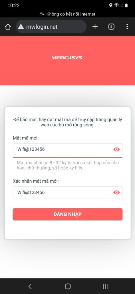 Tạo mật khẩu để Đăng nhập vào thiết bị kích sóng wifi này. Nhập 2 dòng mật khẩu giống nhau, gồm chữ Viết Hoa, chữ thường, thêm @ và số. Ví dụ: Wifi@123456. Sau đó Nhấn ĐĂNG NHẬP