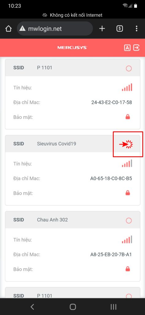 Bước 5: Tìm và nhấn tích vào ô tròn của tên wifi cần kích sóng trong danh sách hiện ra (ví dụ: Cần kích sóng wifi Sieuvirus Covid19 thì nhấn vào ô tròn bên phải). Nếu chưa hiện tên wifi cần kích hãy kéo xuống dưới và nhấn vào nút Quét để tìm lại.