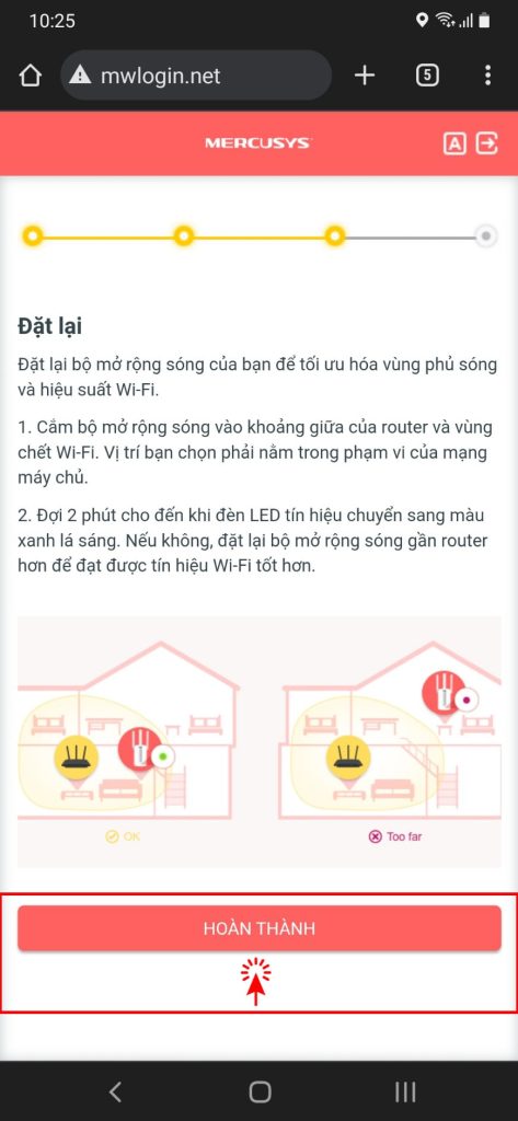Như vậy, các bước cài đặt đã hoàn thành. Bạn hãy quan sát đèn báo trên bộ kích sóng nếu đã chuyển sang màu Xanh lá hoặc màu Vàng là bạn đã cài đặt xong.