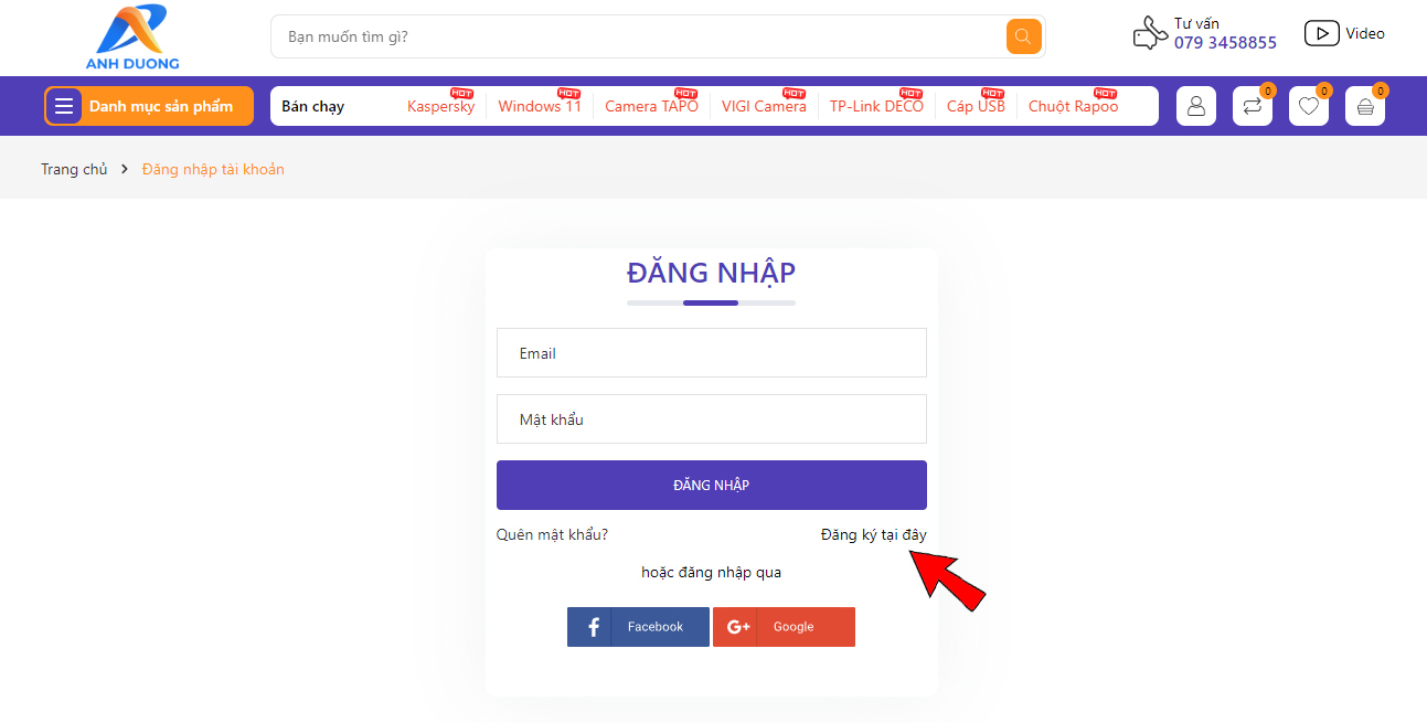 Bước 2: Nhấn chọn "Đăng ký tại đây" để tiến hành đăng ký tài khoản hoặc bấm vào Đăng nhập qua Facebook, Google: