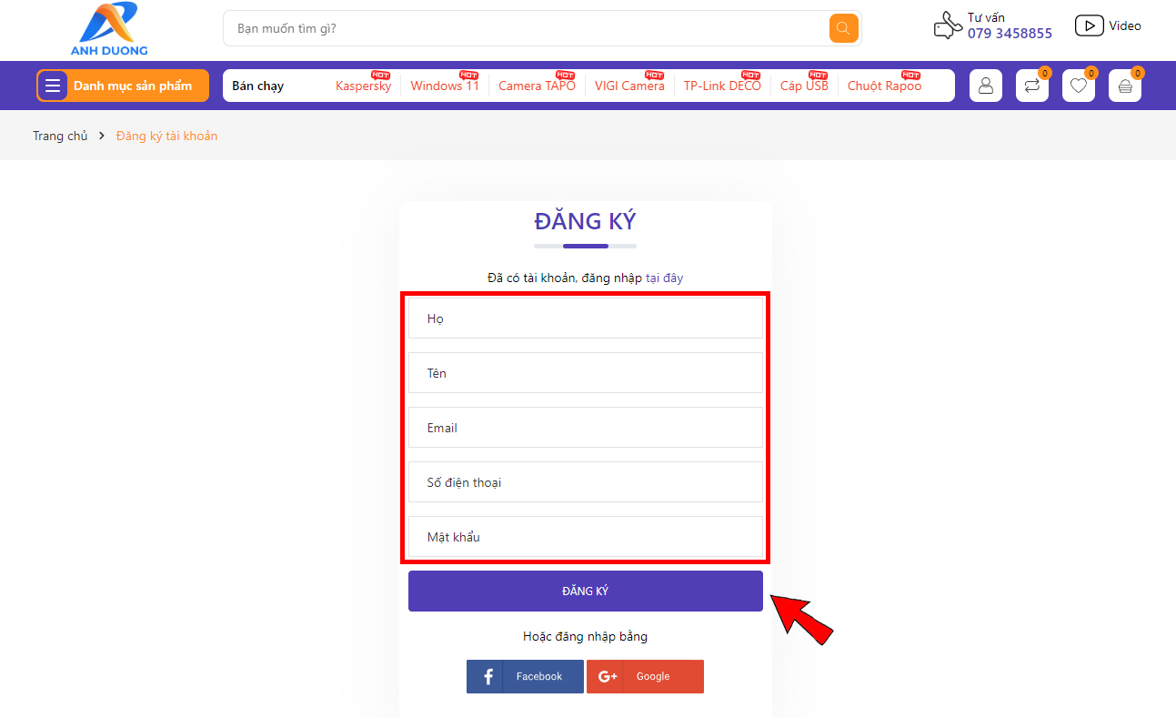Bước 3: Điền thông tin Họ, Tên, Email, Số điện thoại, Mật khẩu. Sau đó nhấn chọn "Đăng ký" để tạo tài khoản