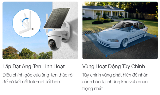 Ghi lại những khoảnh khắc hoàn hảo mà không bị giới hạn bởi ổ cắm điện hay Wi-Fi, lý tưởng cho các khu vực như trang trại, khu cắm trại, công trường và nhà nghỉ. Có thể gắn camera và tấm pin năng lượng mặt trời thành một khối gọn gàng hoặc kết nối qua cáp dài 4 mét để tối ưu ánh sáng mặt trời.