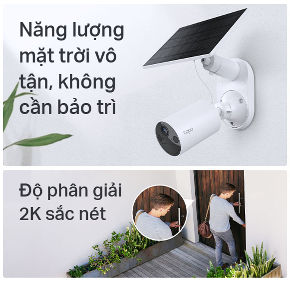 - Nguồn cấp điện không gián đoạn: Tận hưởng trải nghiệm bảo mật không cần bảo trì với Tấm pin năng lượng mặt trời Tapo, cung cấp nguồn điện liên tục và lắp đặt linh hoạt.