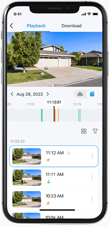 Nhanh chóng tìm và tải xuống những khoảnh khắc quan trọng bằng cách chọn loại sự kiện hoặc trượt trên dòng thời gian.