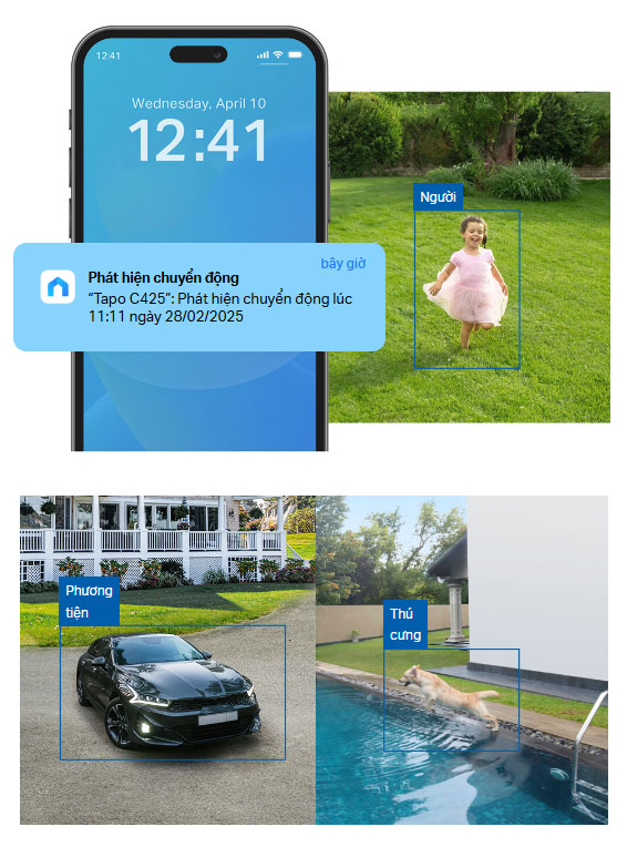 AI thông minh nhận diện người, thú cưng và phương tiện, chỉ gửi cảnh báo khi thực sự cần thiết. Tùy chỉnh vùng phát hiện để nhận cảnh báo tại những khu vực quan trọng nhất.