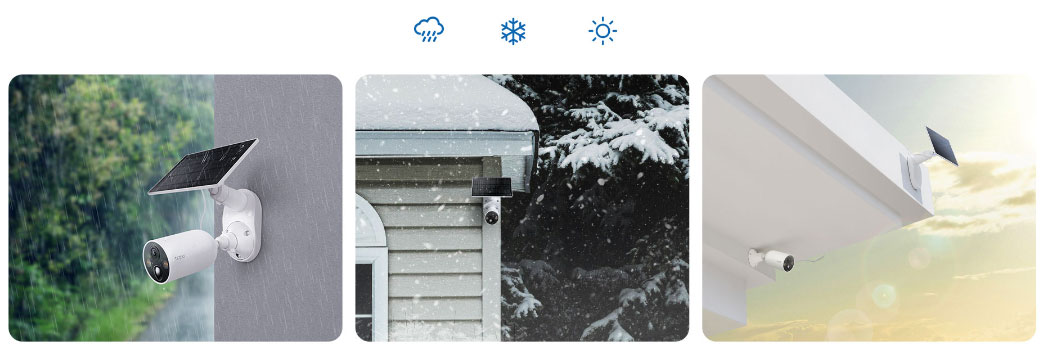 Camera Tapo C425 chuẩn IP66 và Tấm pin năng lượng mặt trời chuẩn IP65 chống nước chống bụi. Sản phẩm hoạt động tốt trong mưa, tuyết, bụi và nhiệt độ khắc nghiệt, đảm bảo vận hành ổn định trong khoảng nhiệt độ từ -20°C đến 45°C (-4°F ~ 112°F).