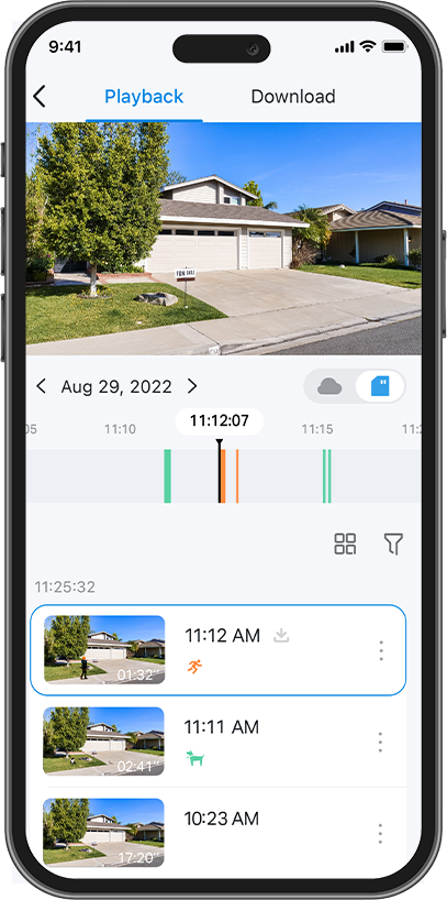 Tìm và tải xuống nhanh chóng những khoảnh khắc quan tâm bằng cách chọn loại sự kiện hoặc lướt dòng thời gian.