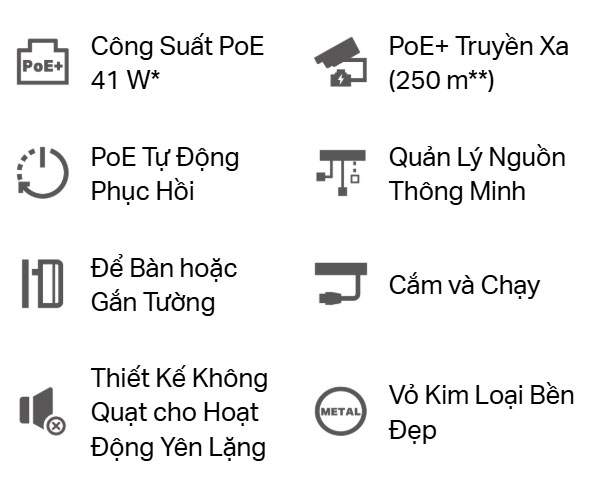 Tuân thủ các tiêu chuẩn IEEE 802.3af/at PoE, switch hỗ trợ tổng công suất PoE là 41 W và tối đa 30 W trên mỗi cổng PoE+. Khi tổng mức tiêu thụ điện năng vượt quá 41 W, tính năng quản lý nguồn điện thông minh sẽ cắt nguồn điện của các cổng có mức ưu tiên thấp hơn để bảo vệ thiết bị khỏi bị hư hỏng.